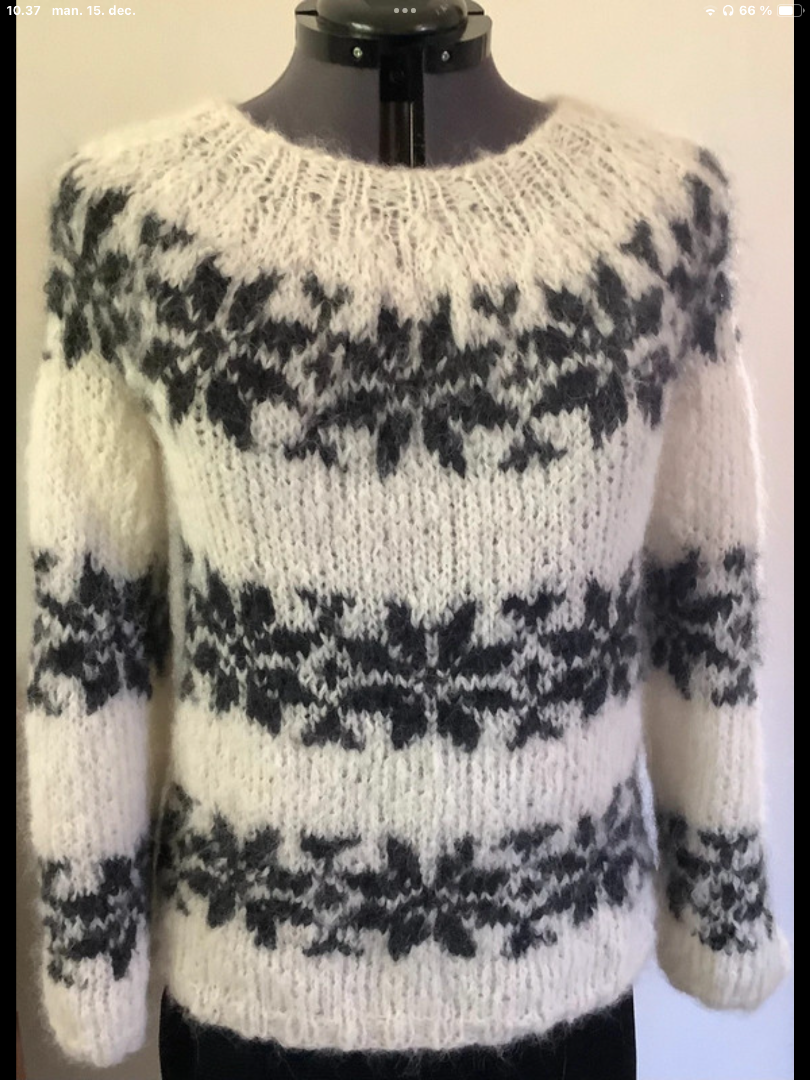 Sarah Lund i nyt design. Håndstrikket i fluffy alpaca og uld. Sweater har hvid bund og sorte stjerner og er lidt chunky i modellen og sidder ikke så tæt som mine Sara Lund i islandsk uld.