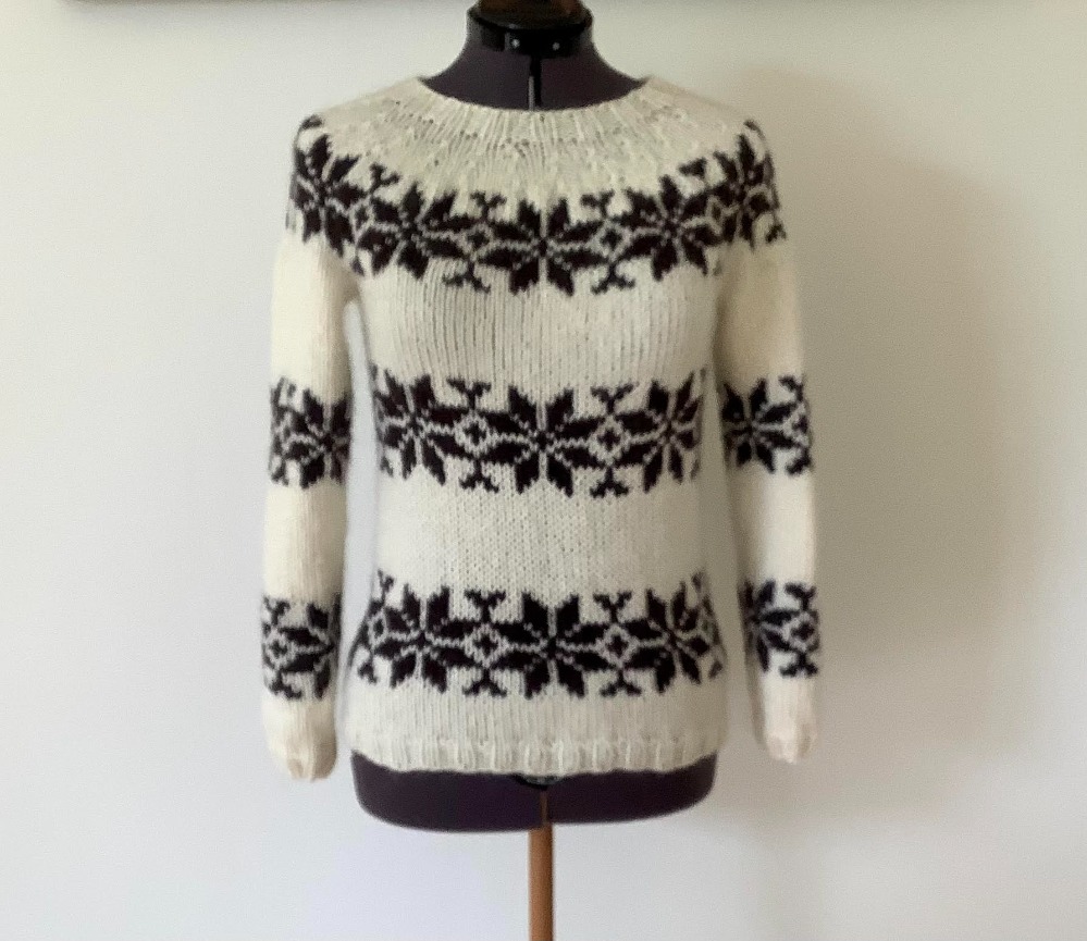 Nyt design! Håndstrikket Sarah Lund i klassisk udgave, MEN strikket i den blødeste Kashmir (20%) merino (80%). Farverne er hvid bund med mørkebrune stjerner.