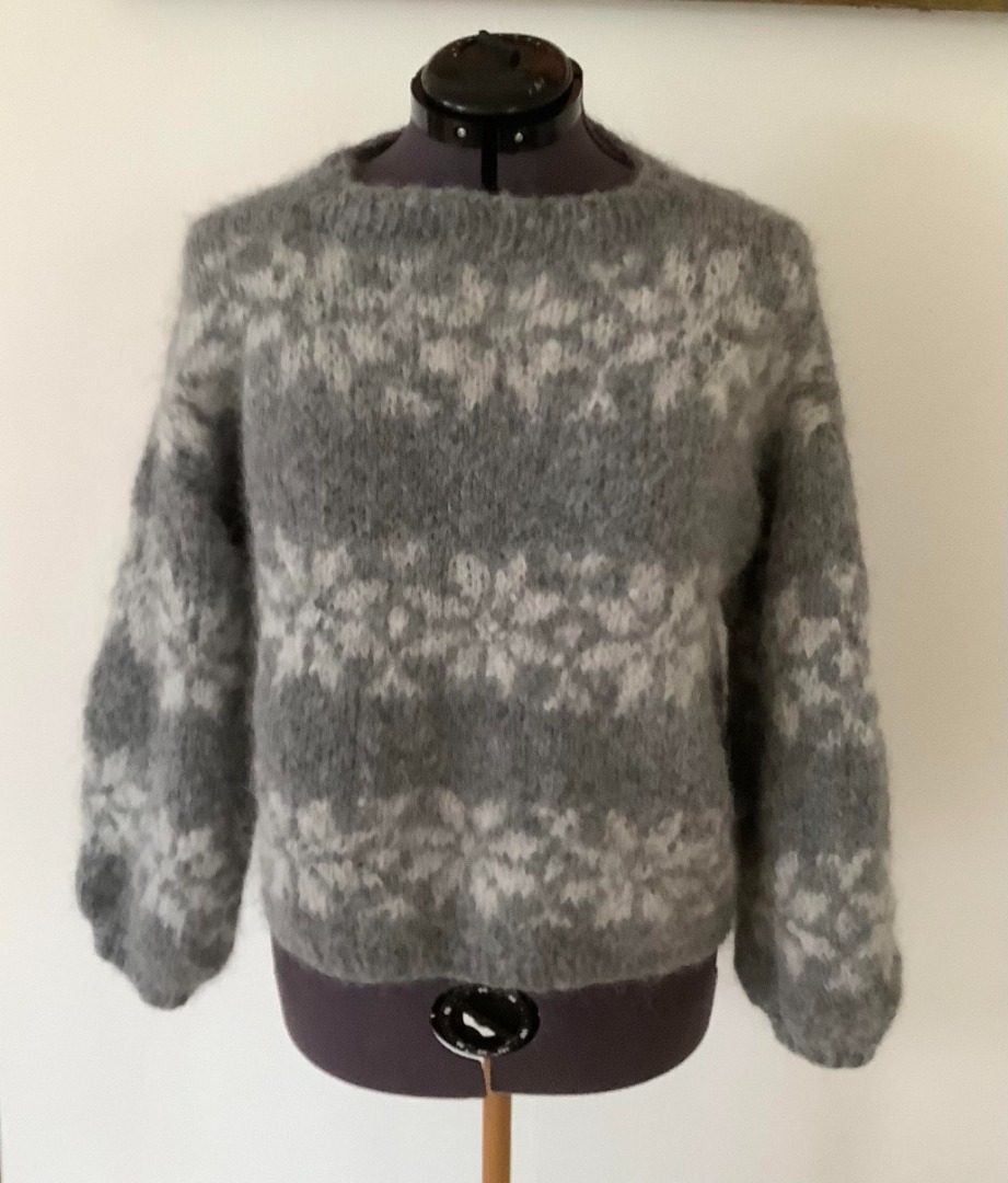 Sarah Lund i nyt design med overskårne ærmer og viddere ærmer. Garnet er dejligt blødt og super let alpaca og farverne er mellemgrå bund med lyse grå stjerner