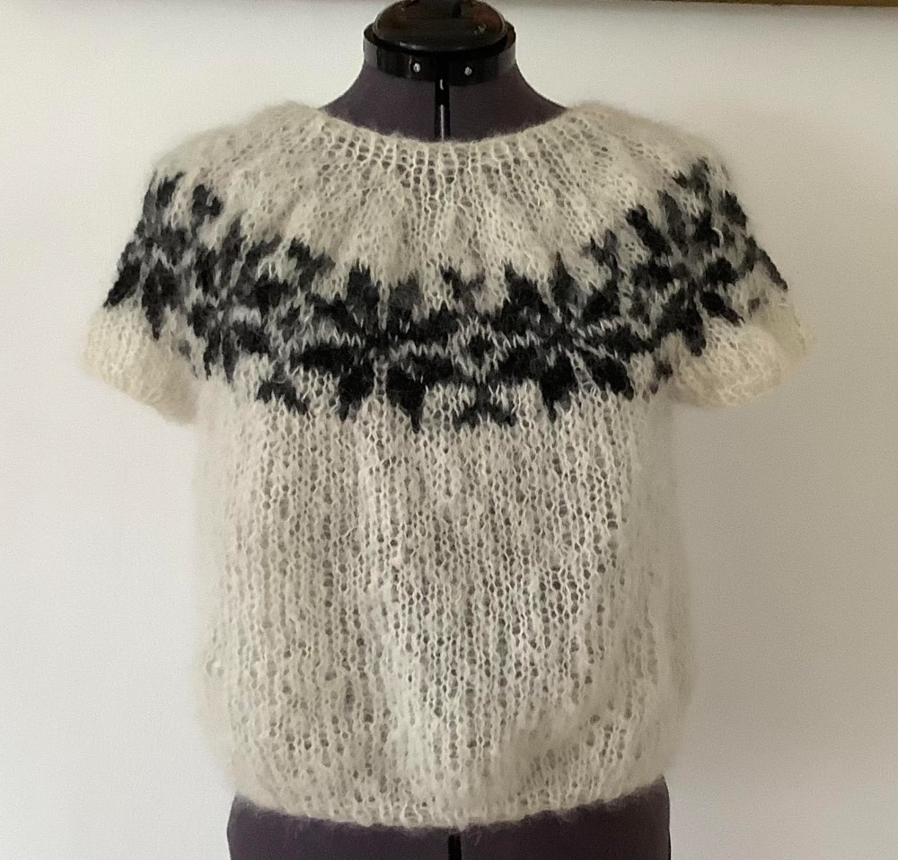 Skøn kortærmet Sarah Lund - håndstrikket i mohair fra LIne Langmo. Blusen er superblød og let som fnug. Bunden er hvid og stjernerne er meleret sorte.