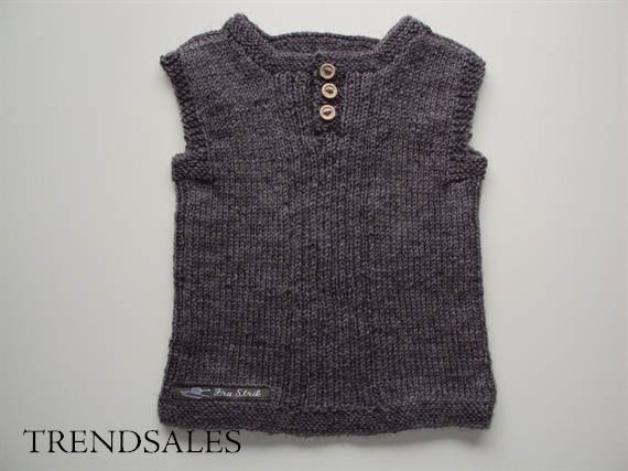 Vest til baby - håndstrikket i ren lammeuld med flot mønster og fine træknapper. Farven er koksgrå.
